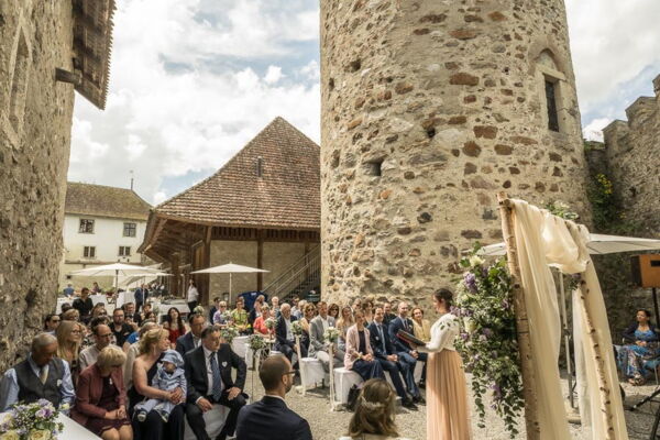 Im märchenhaften Schloss Hallwyl gaben sich die beiden ihr Ja-Wort, umrahmt von Geschichte und Herzklopfen. Beim anschliessenden Paarshooting drehte der elegante Oldtimer genüsslich seine Runden und stahl fast die Show – fast.