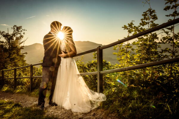 Ein goldener Herbsttag auf der majestätischen Habsburg: Warmes Licht tanzt über alte Mauern, bunte Blätter wirbeln im Wind und umrahmen ein Fest voller Liebe.